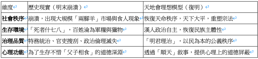 • 復明: 透過文本分析與會簿考證,此處的「明」並非指已然崩潰、腐敗的晚明朝代,而是「明君理治」與「光明秩序」的政治象徵。它是對恢復「天命秩序」的道德假設,而非具體的政權復辟。