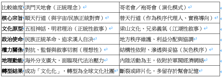 透過表格可見,洪門天地會的正統性在於其「超越性」——它不因明朝滅亡而消散,反而因其理想化的「復明」敘事而在海外法治環境中獲得了文化上的重生。反之,哥老會因其強烈的地方實務性與權力依附性,使其在體制更迭後難以脫離「幫會」標籤,面臨傳承中斷與認同危機。